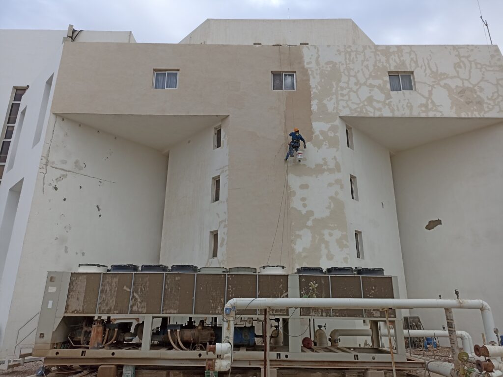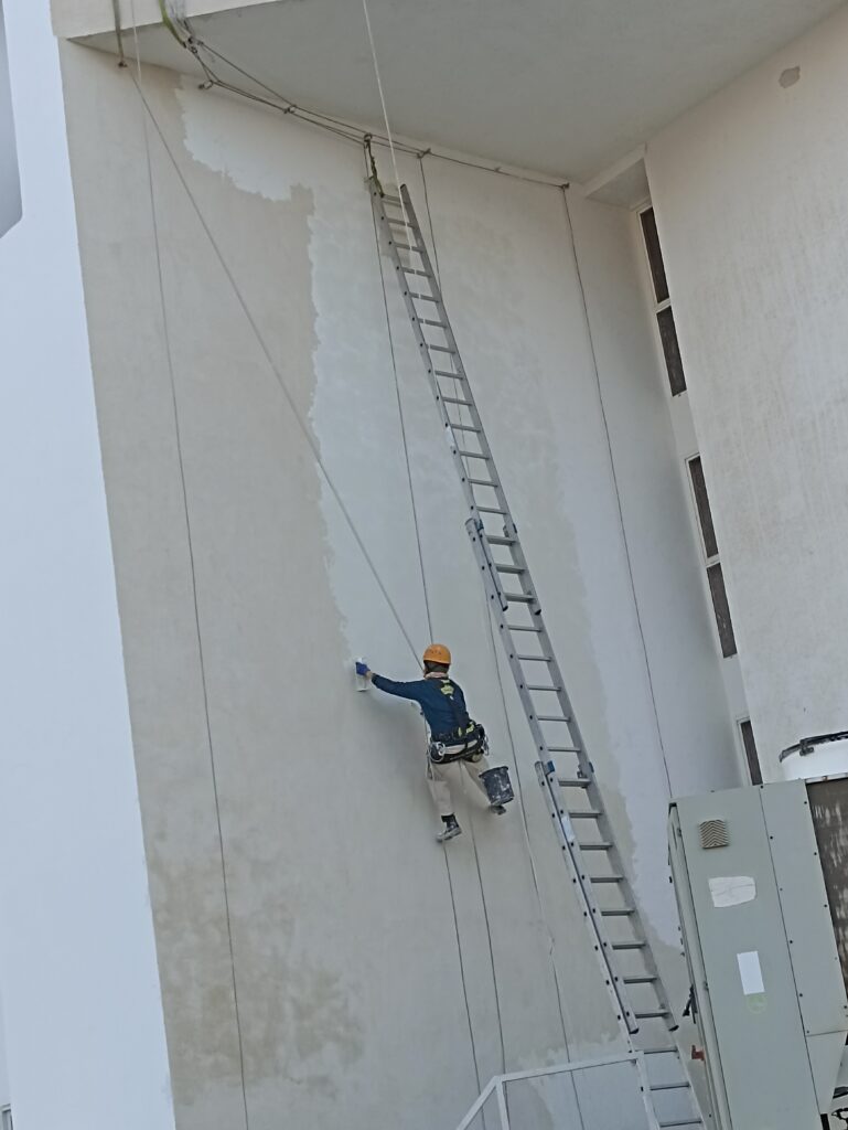 The job was challenging: tight access, climbing gear, and heights. We combined ladders and rope access, installing anchor points directly on the facade.